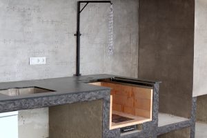 Ipari megjelenésű burkolat készült egy modern balatonberényi ház kerti grilljéhez.