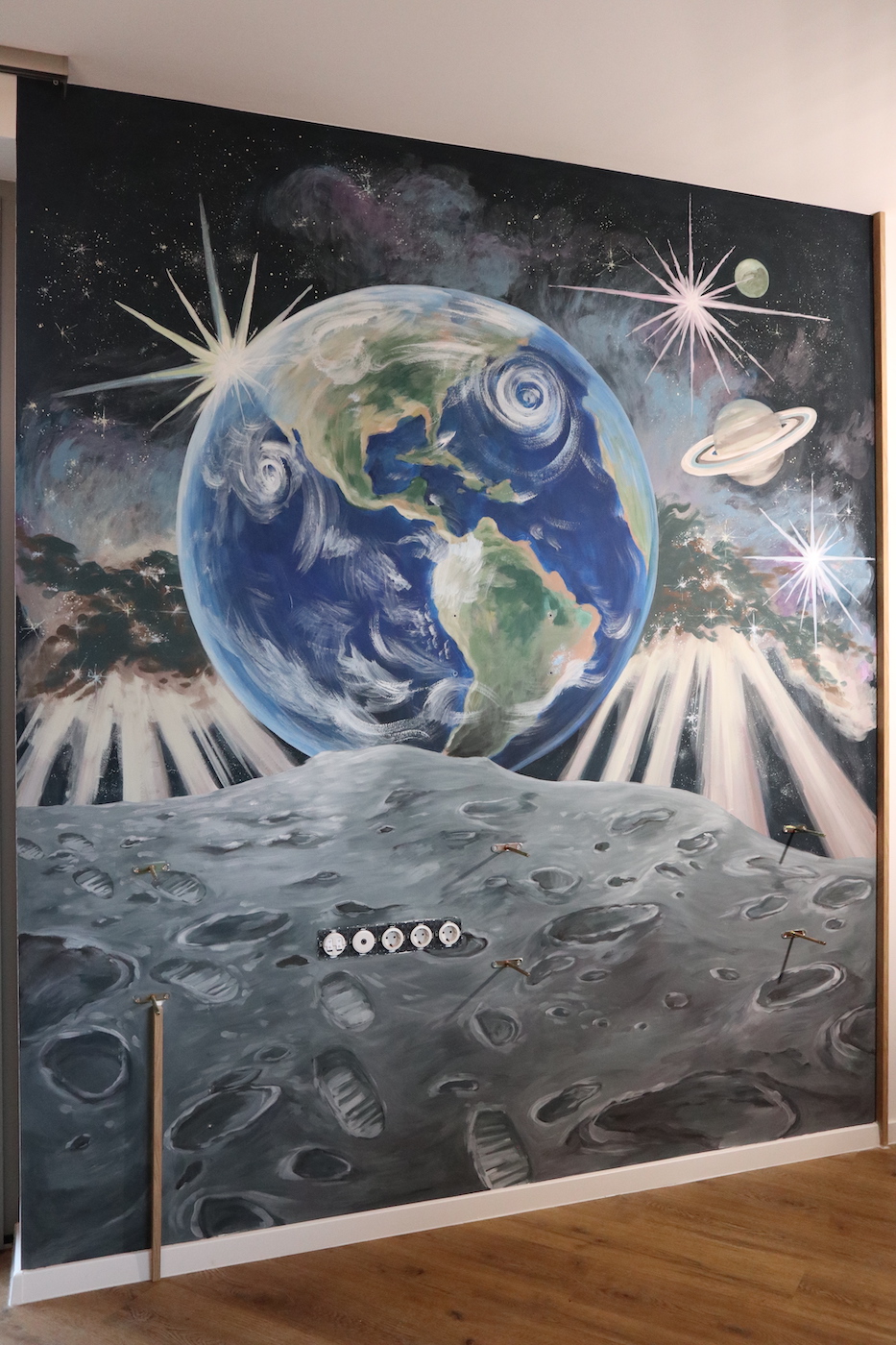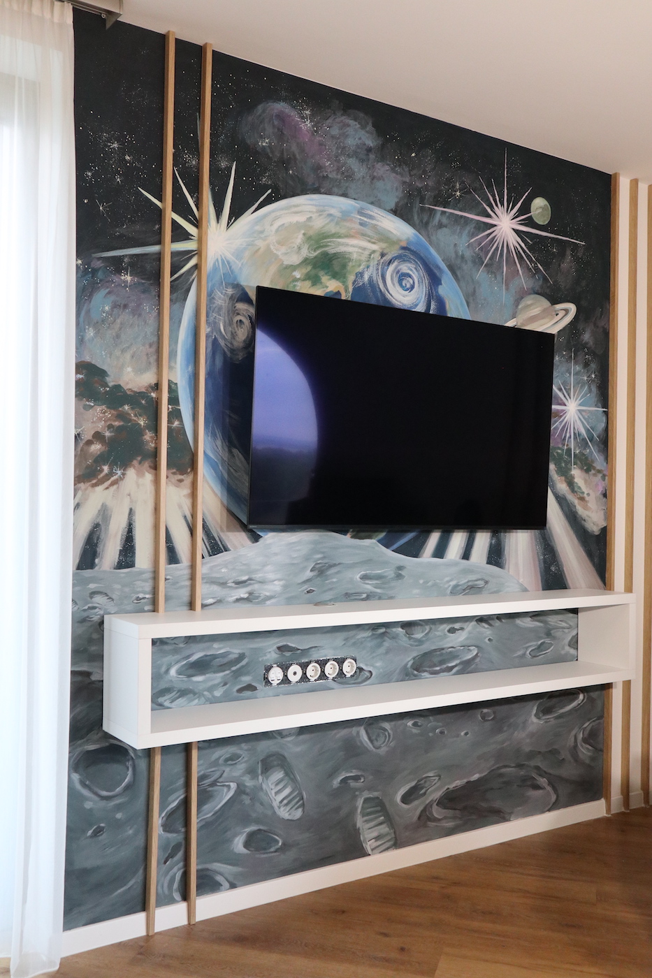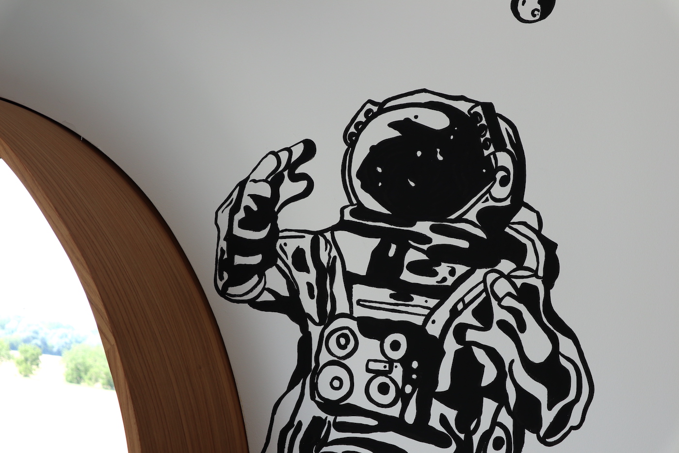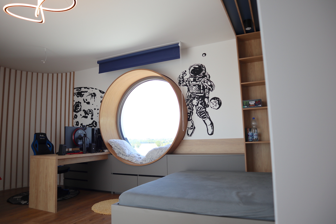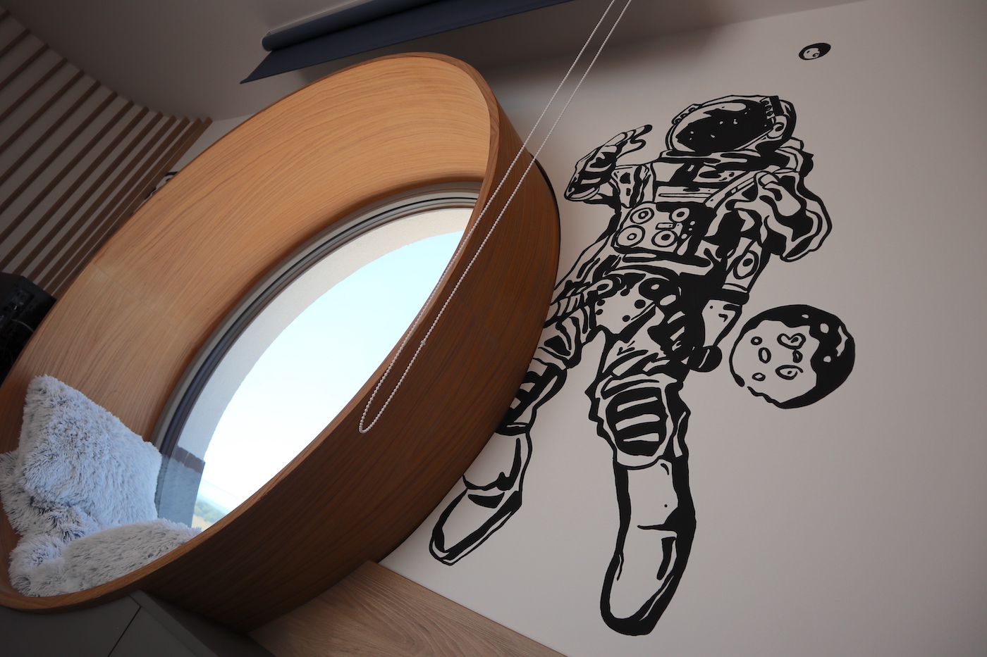 Egy modern balatonberényi ház gyerekszobája ad teret egy holdbéli űrsétához, ahol a hatalmas, beülős körablak szolgáltatja a díszletet.
